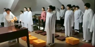 頭的是一位頭髮花白、穿著樸素古裝的老婦人,後面跟隨的是一群美麗年輕的白衣女子。只見這時, 師母大人立即跪下叩首,弟子後學很是納悶:為什麼