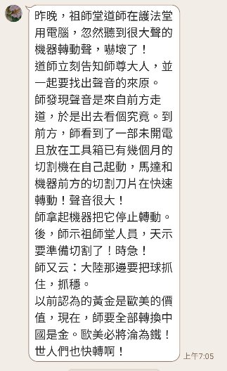 昨天晚上切割機器在沒有輸入電流的情況下,自己啟動了!又特別的大聲!有別以往。是雷神對世人的憤怒!氣到請祖師放棄未度眾生,祂們要一次將之毀滅!